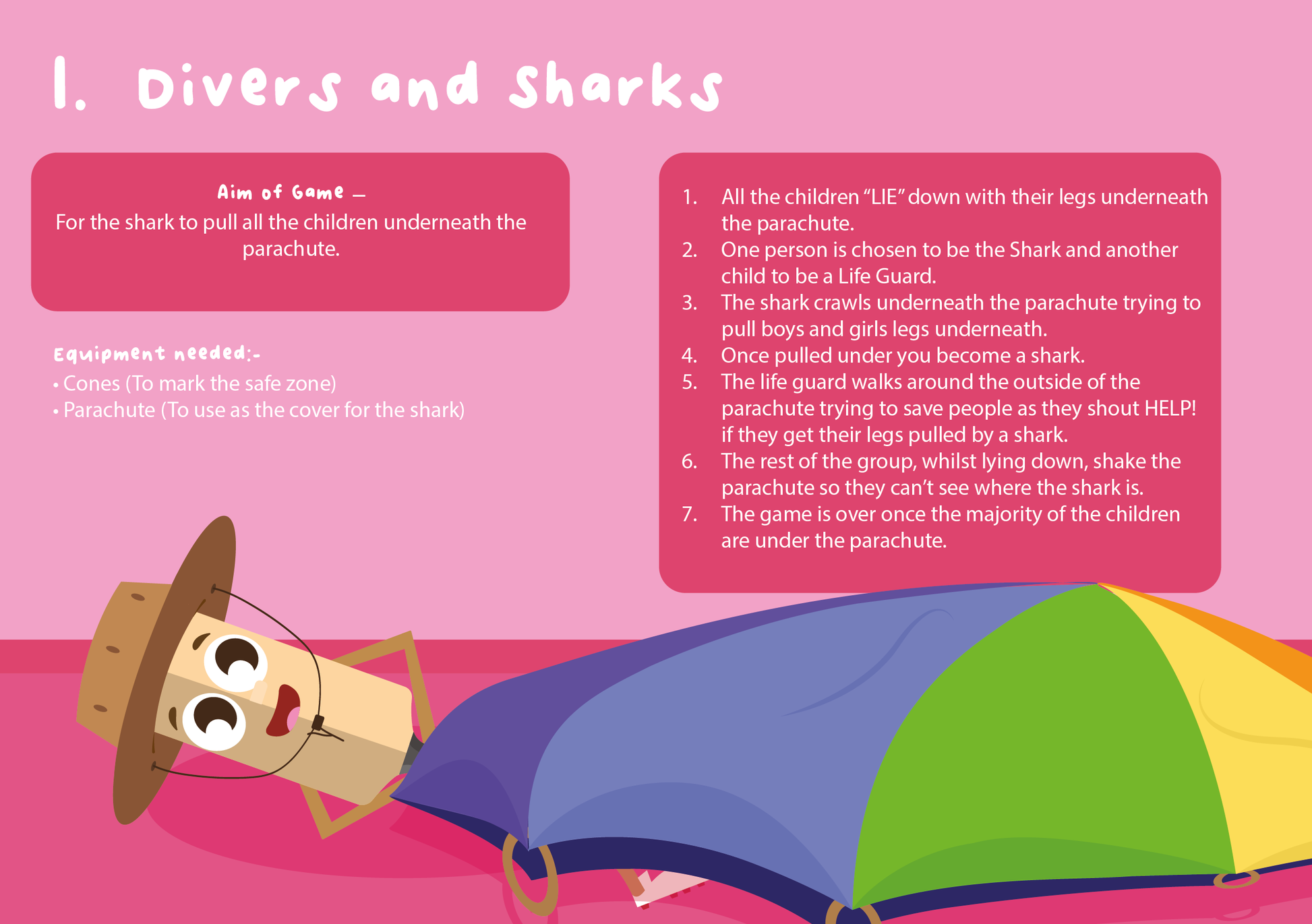 10 of the best Parachute Games are included in this booklet and are one of the most popular topics you can deliver to children. Games such as Tom and Jerry, Divers & Sharks and Bulls Eye build on teamwork, communication and having fun as part of a group. Smiles are always included.
